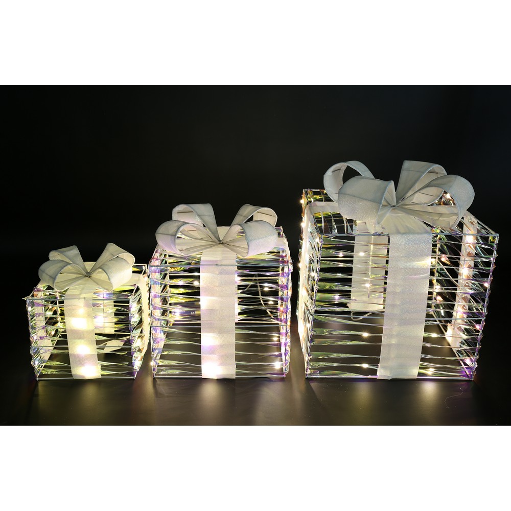 S/3 PACCHI REGALO IRIDESCENTI LED D24-D19-D14 CM BATTER. (Cod. 38857-01)